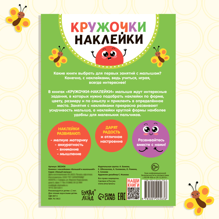 Развивающие наклейки-кружочки пригодятся при обучении малышей важным навыкам. Книга «Большой и маленький» направлена на тренировку цветовосприятия, запоминание оттенков и соотношение размеров.