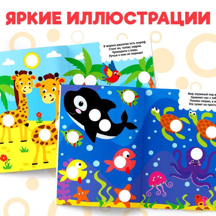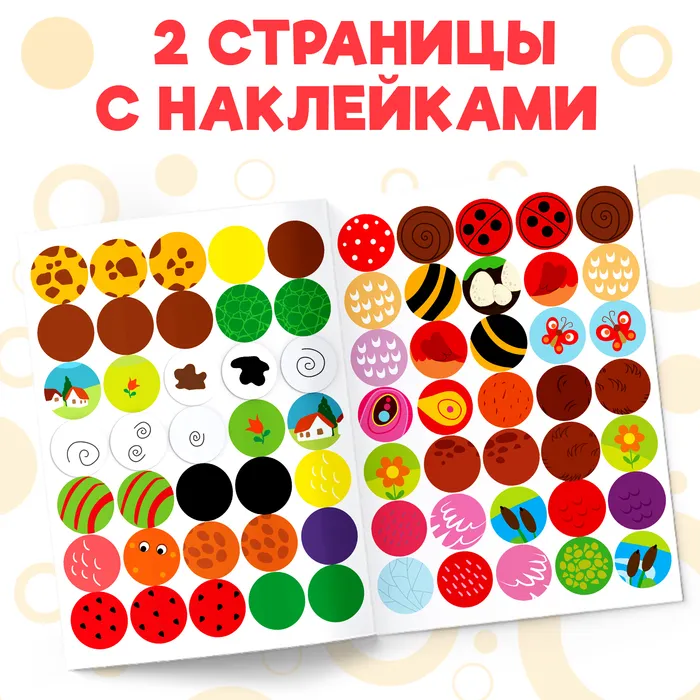 - Красочные картинки и милые персонажи подскажут, куда именно нужно прикрепить наклейку-кружочек.