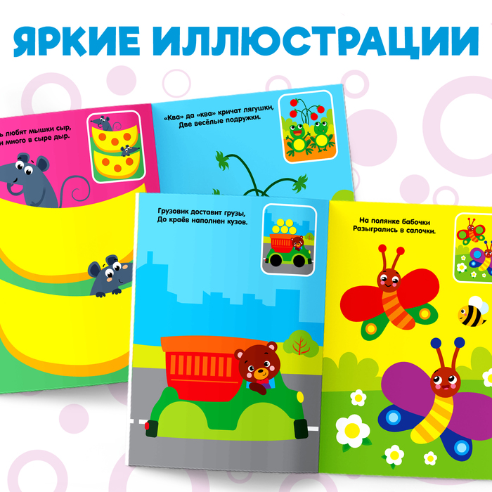 - На каждой странице книжки свой сюжет, короткое стихотворение про героев и образец, куда именно нужно приклеить кружочек.