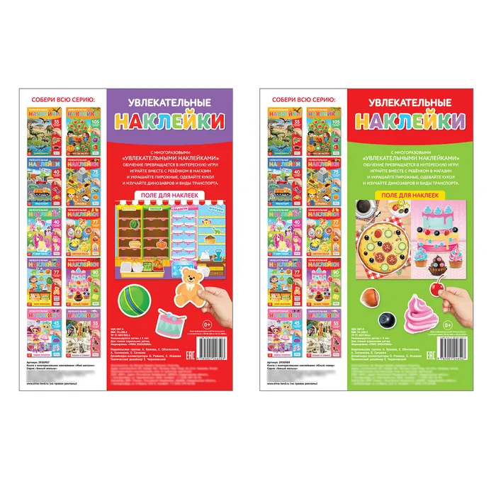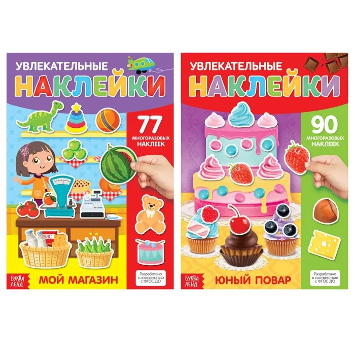 Набор многоразовых наклеек включает в себя 2 издания разной тематики: «Мой магазин» и «Юный повар». Превращайте обучение в увлекательную игру и развивайте полезные навыки.