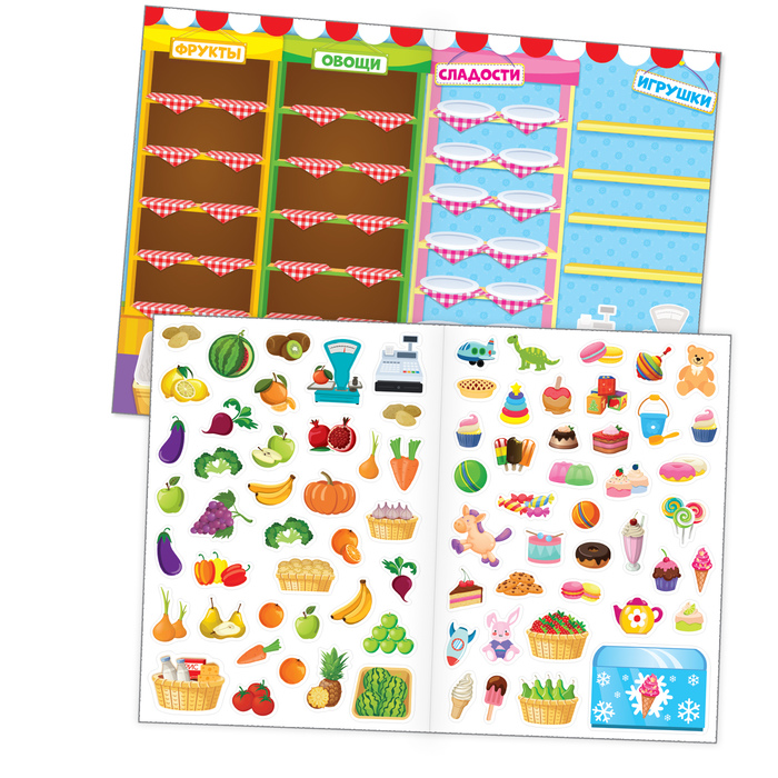 С многоразовыми наклейками ребёнок оформит свой магазин, придумает и украсит кулинарный шедевр, а также потренирует воображение, аккуратность, пространственное мышление и мелкую моторику рук.
