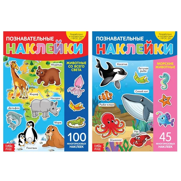 Набор многоразовых детских наклеек включает в себя 2 издания разной тематики: «Животные со всего света» и «Морские животные». Занятия с такими книгами помогут узнать много нового и потренировать важные навыки.