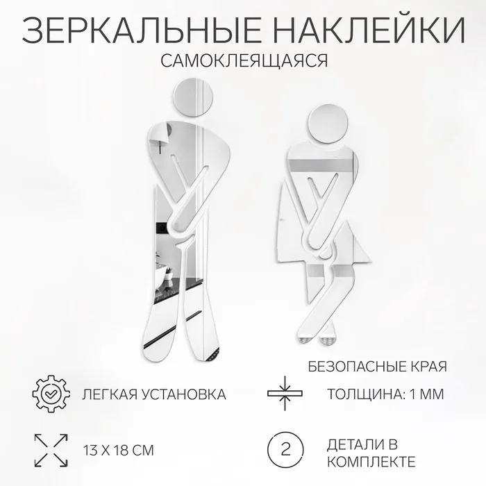 Создайте стильный и функциональный декор для общественных помещений с этими элегантными зеркальными наклейками! Комплект включает два зеркальных кружочка диаметром 10.7 см, выполненных из акрилового материала. На одной наклейке изображены символы, обозначающие мужской и женский туалет, а на другой — ванна и льющаяся вода из душа над ней.