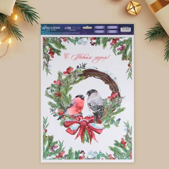 Наклейка для окон «С Новым годом», снегири, многоразовая, 33 х 50 см