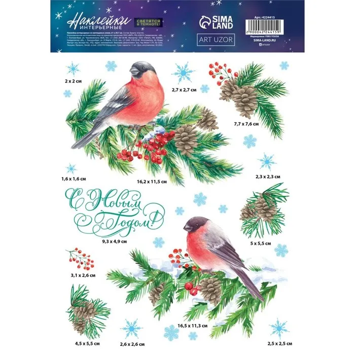 Наклейки новогодние, интерьерные со светящимся слоем «Снегири», 21 х 29.7 см