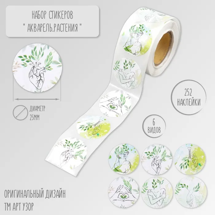 Набор наклеек для декора «Арт Узор. Акварель. Растения», в рулоне, бумага, d=2.5 см, 252 шт.