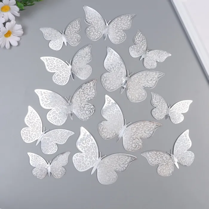 Наклейка бумага, пластик "Цветочные бабочки серебро" блёстки набор 12 шт 12 см, 10 см 8 см 1052426