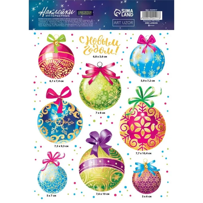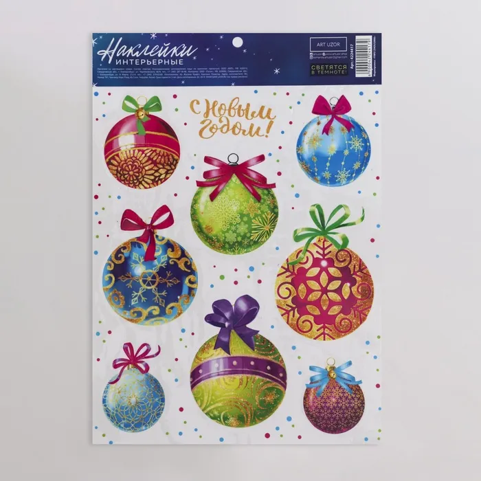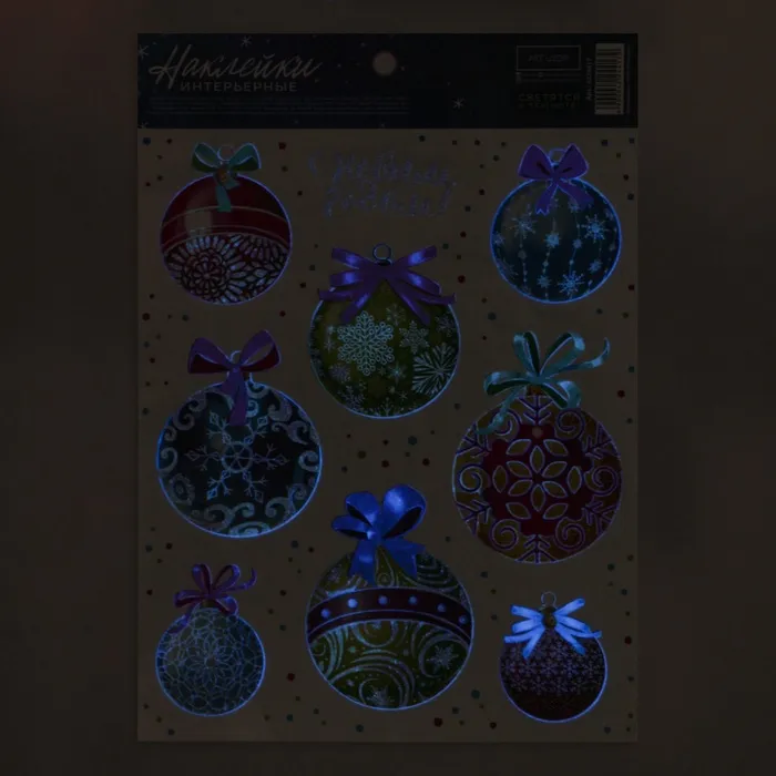 Наклейки новогодние, интерьерные со светящимся слоем «Ёлочные игрушки», 21 х 29.7 см — Характеристики