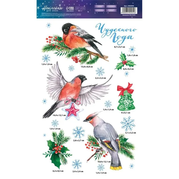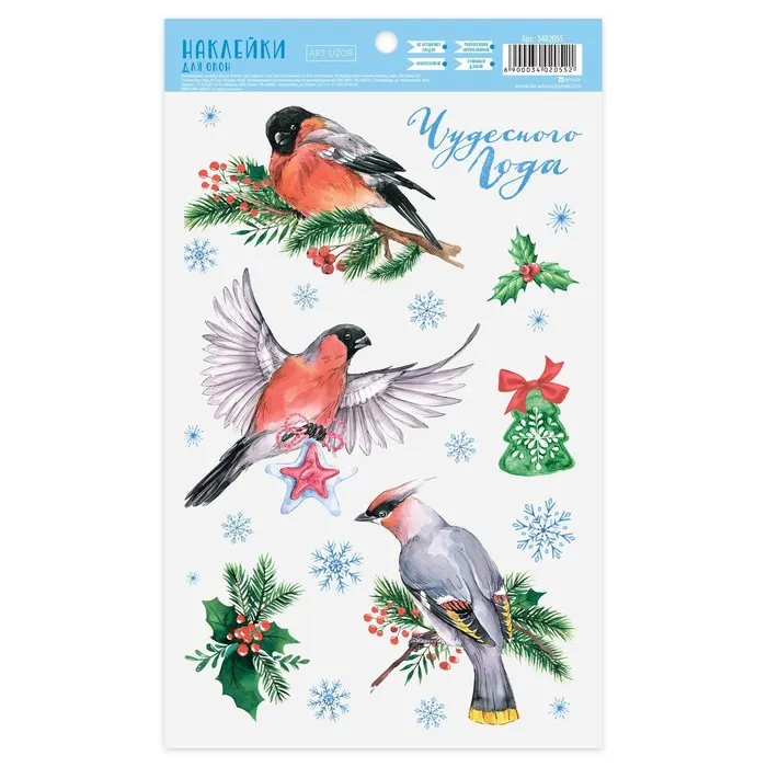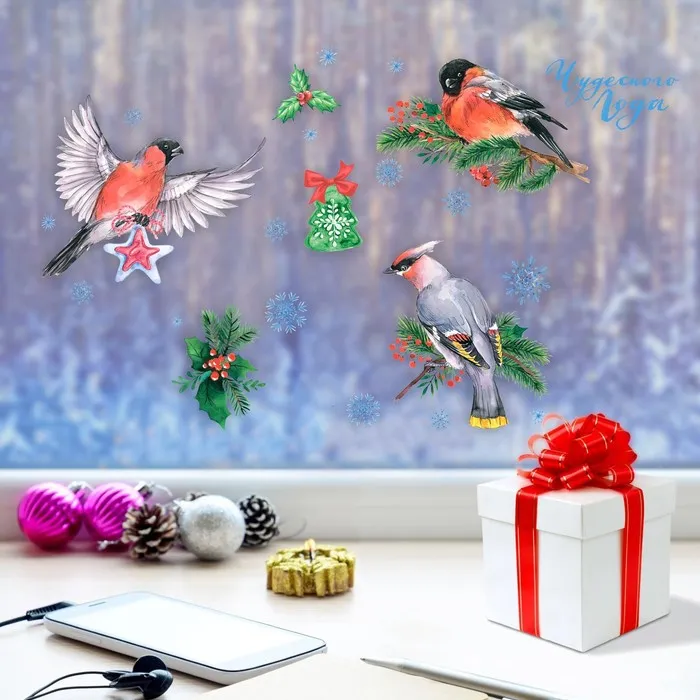 Наклейки новогодние на окна «Снегири», 20 х 34 см, многоразовые — Характеристики