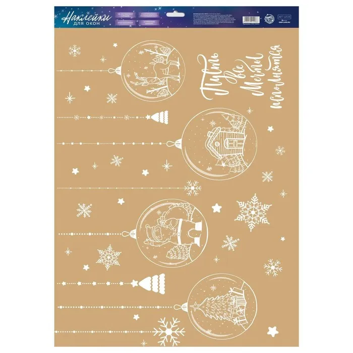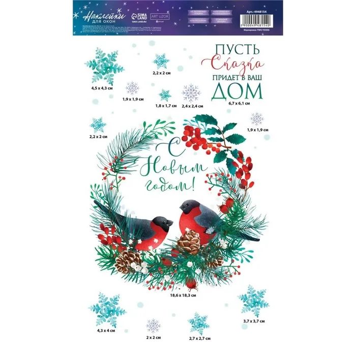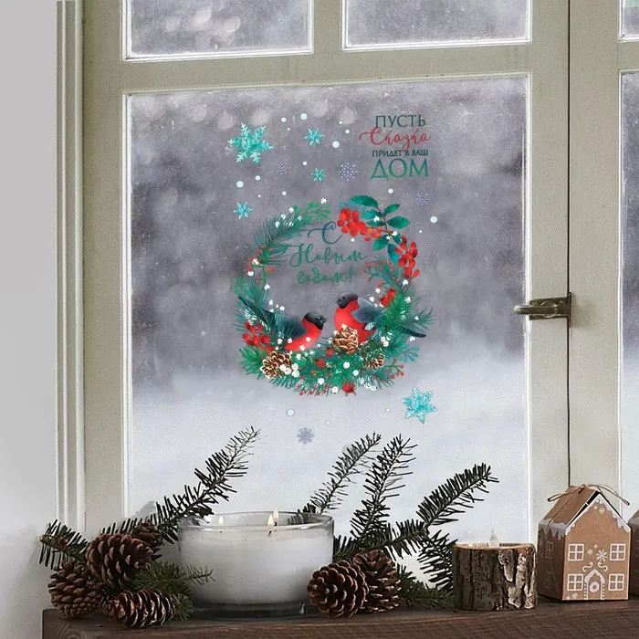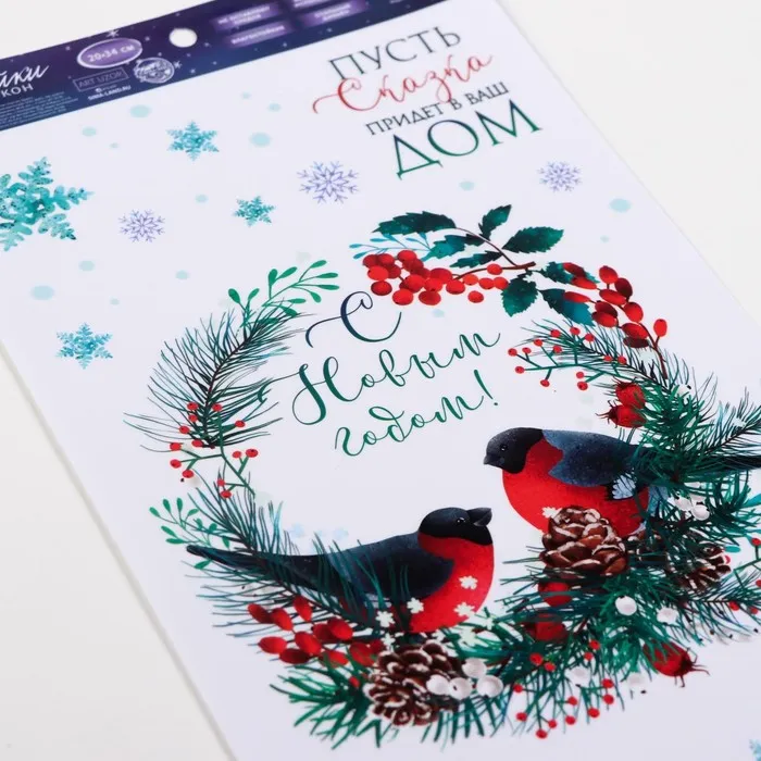Наклейки новогодние на окна «Снегири на венке», многоразовые, 20 х 34 см — Характеристики