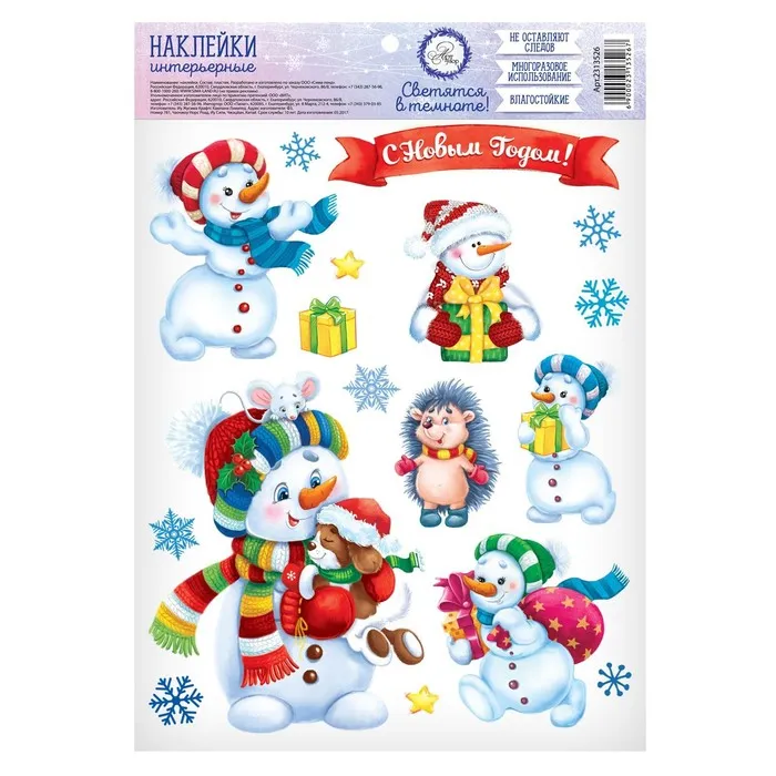 Наклейки новогодние, интерьерные со светящимся слоем «Снеговички», 21 х 29,7 см