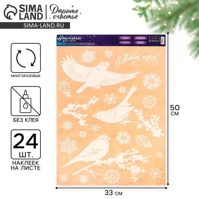 Наклейки новогодние на окна «Зимние птички» , многоразовые, 33 х 50 см