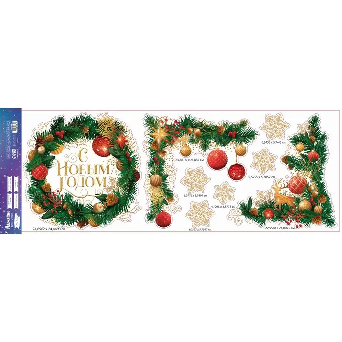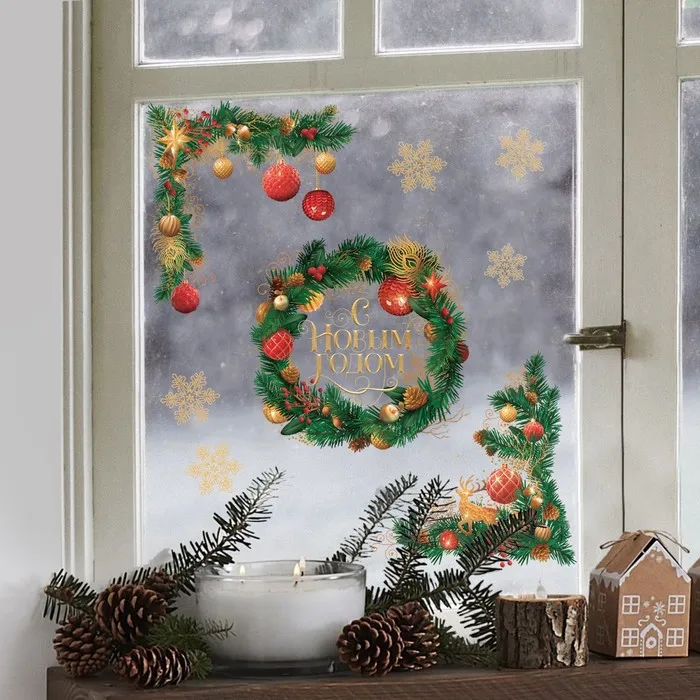 Наклейки новогодние на окна, виниловые «Новогодний венок», многоразовые, 70 х 25 см — Характеристики