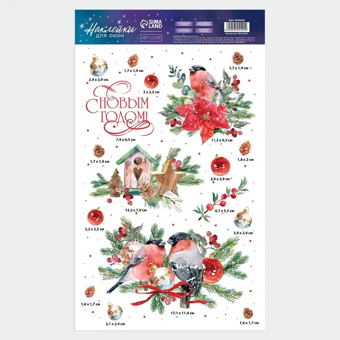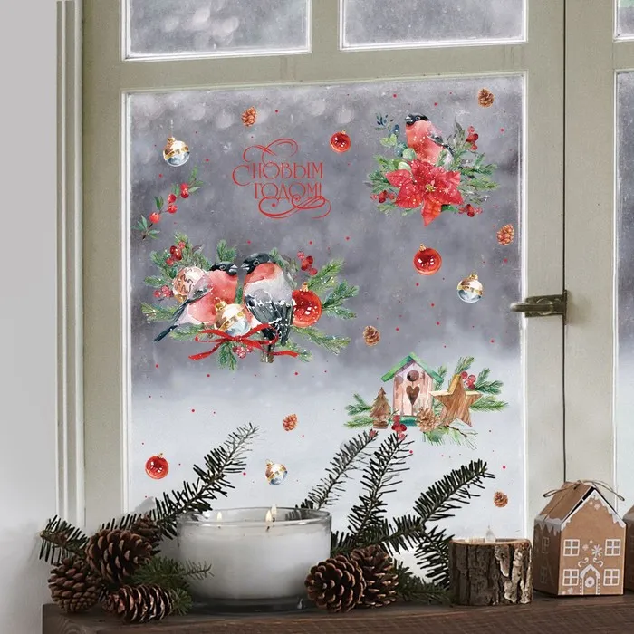 Наклейки новогодние на окна, виниловые «Снегири», многоразовые, 20 х 34,5 см — Характеристики