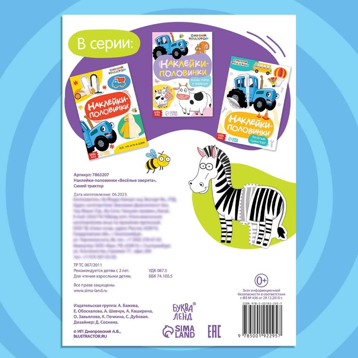 Наклейки - половинки «Весёлые зверята», 16 стикеров, Синий трактор — Характеристики