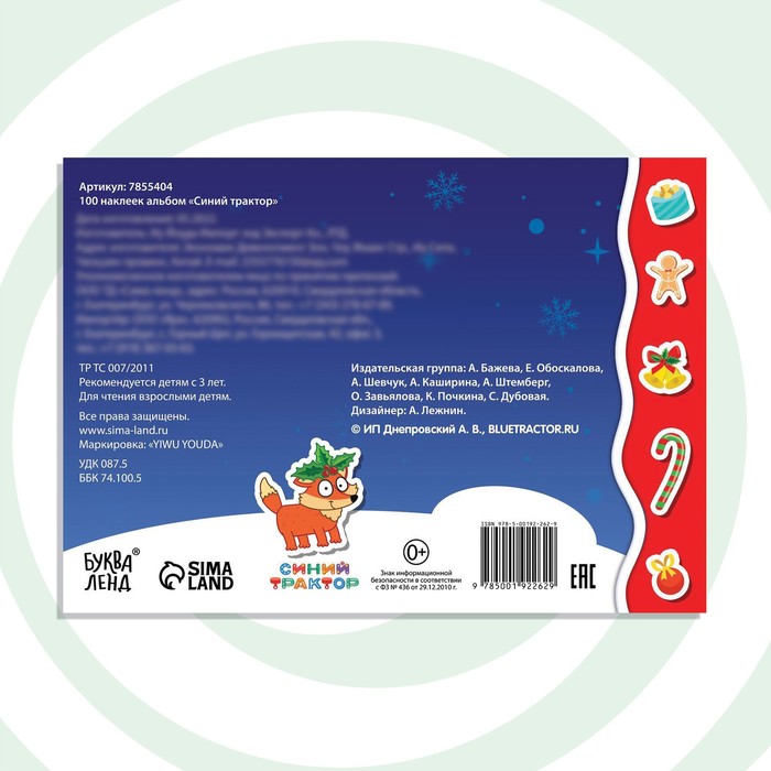 - В альбоме представлено 100 тематических наклеек с красочными изображениями Синего трактора и других героев полюбившегося мультфильма.