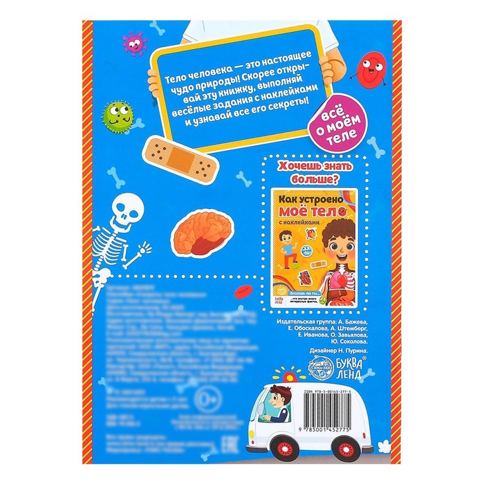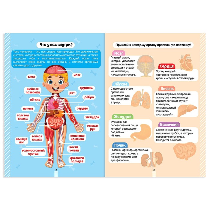 Книга помогает детям в игровой форме изучить основы анатомии. Ребёнок узнает, как работают органы, мышцы и кости, и поймёт, почему тело человека — это настоящее чудо природы. Задания с наклейками развивают мелкую моторику, внимание и любознательность.