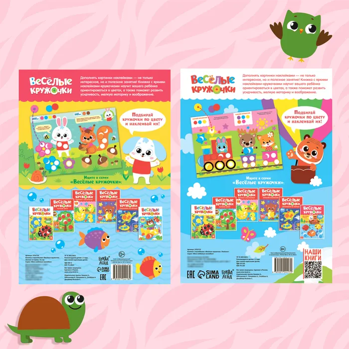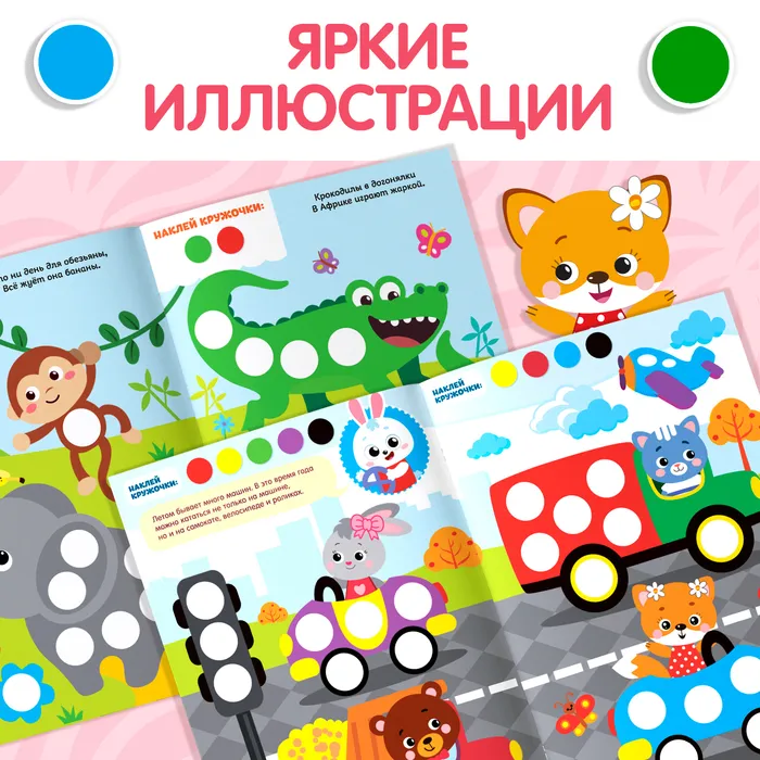 - Красочные картинки и милые персонажи подсказывают, куда именно нужно прикрепить наклейку-кружочек.