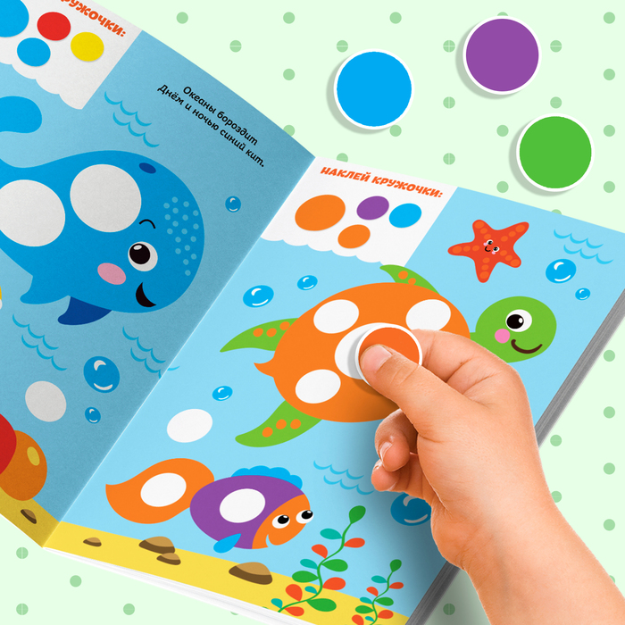 - Красочные картинки и милые персонажи подсказывают, куда именно нужно прикрепить наклейку-кружочек.