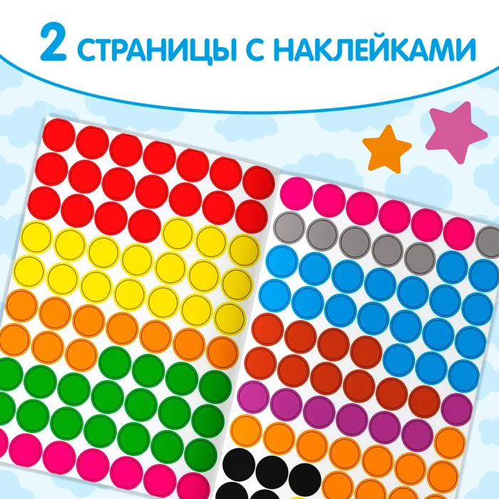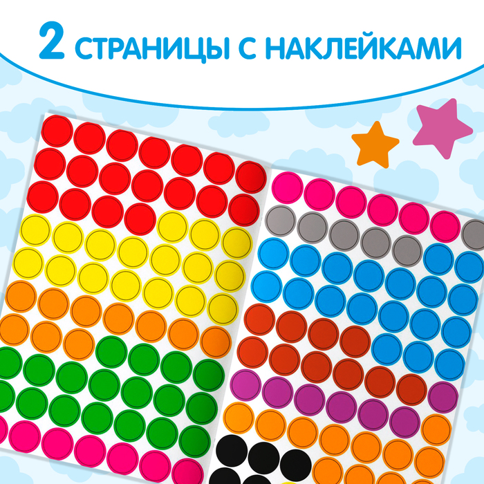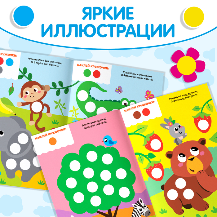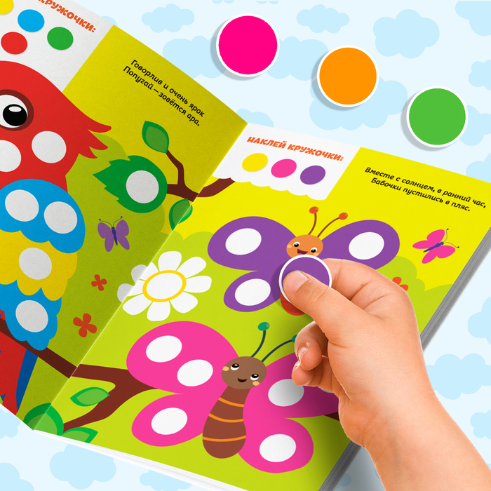 - Красочные картинки и милые персонажи подсказывают, куда именно нужно прикрепить наклейку-кружочек.