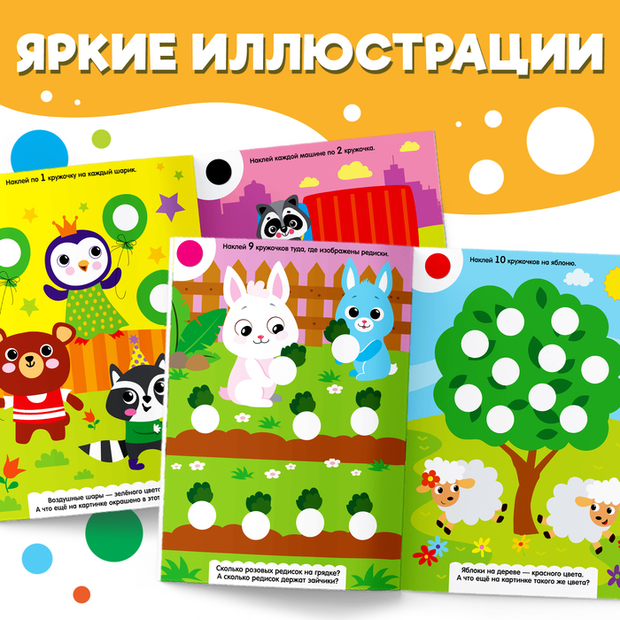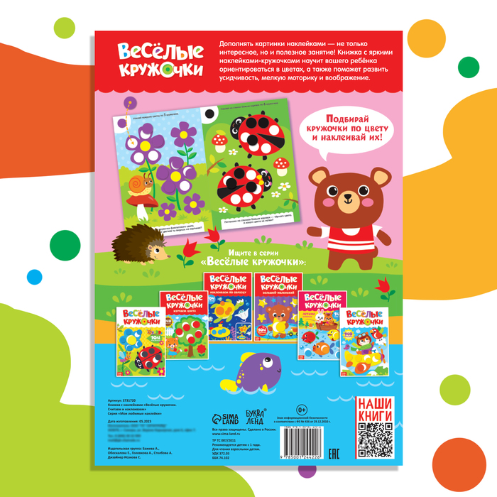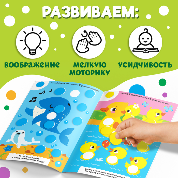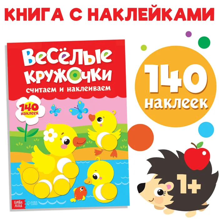 Наклейки «Весёлые кружочки» — это развивающее пособие для детей от 1 года, которое помогает изучать цвета, формы и счёт в игровой форме. В набор входит 140 ярких бумажных наклеек, которые ребёнок использует для выполнения заданий на 16 страницах. Игра с наклейками развивает мелкую моторику, внимание и воображение, а также знакомит с животными и геометрическими фигурами.