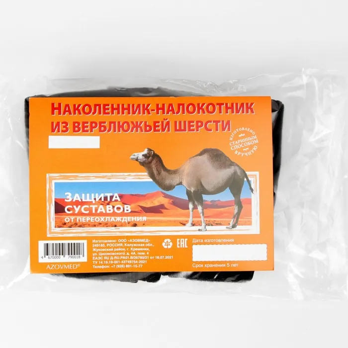 Наколенник-налокотник из верблюжьей шерсти вызывает субъективное ощущение тепла в области сустава, увеличивает и регулирует микроциркуляцию крови в суставе; благодаря наличию собачьей шерсти оказывает микромассажное действие, снимает спазмы и способствует снятию болей в коленном суставе.