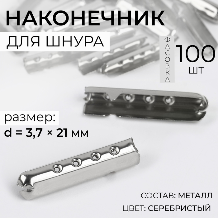 Наконечник для шнура, d=3.7×21 мм, цвет серебряный