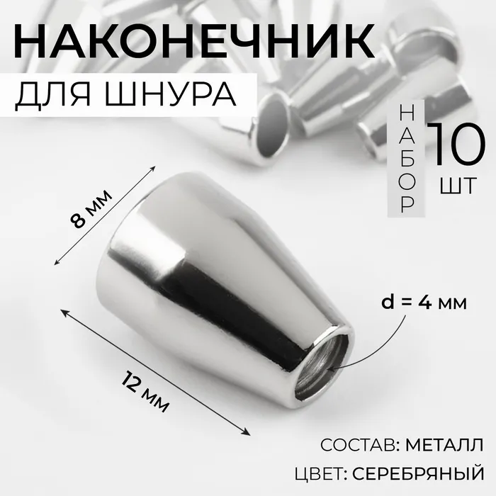 Наконечник для шнура, d=4 мм, 12×8 мм, 10 шт., цвет серебряный — Характеристики