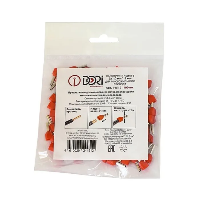 Наконечник DORI втулочный изолированный (НШВИ-2) 2х1,0мм2 d=8мм, 100шт — Характеристики