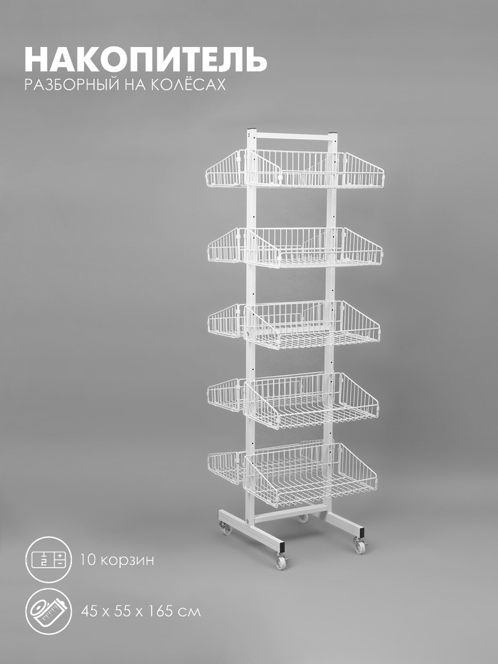 Накопитель разборный на колесах с 5 корзинами — это отличный выбор для людей, которым нужно организовать пространство в доме, при этом сохраняя порядок и лёгкость в перемещении. Его компактные размеры и высокая вместимость делают его универсальным решением для хранения различных вещей.