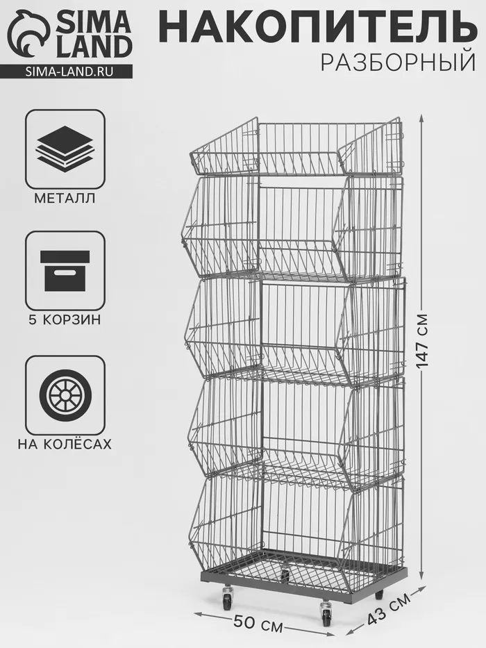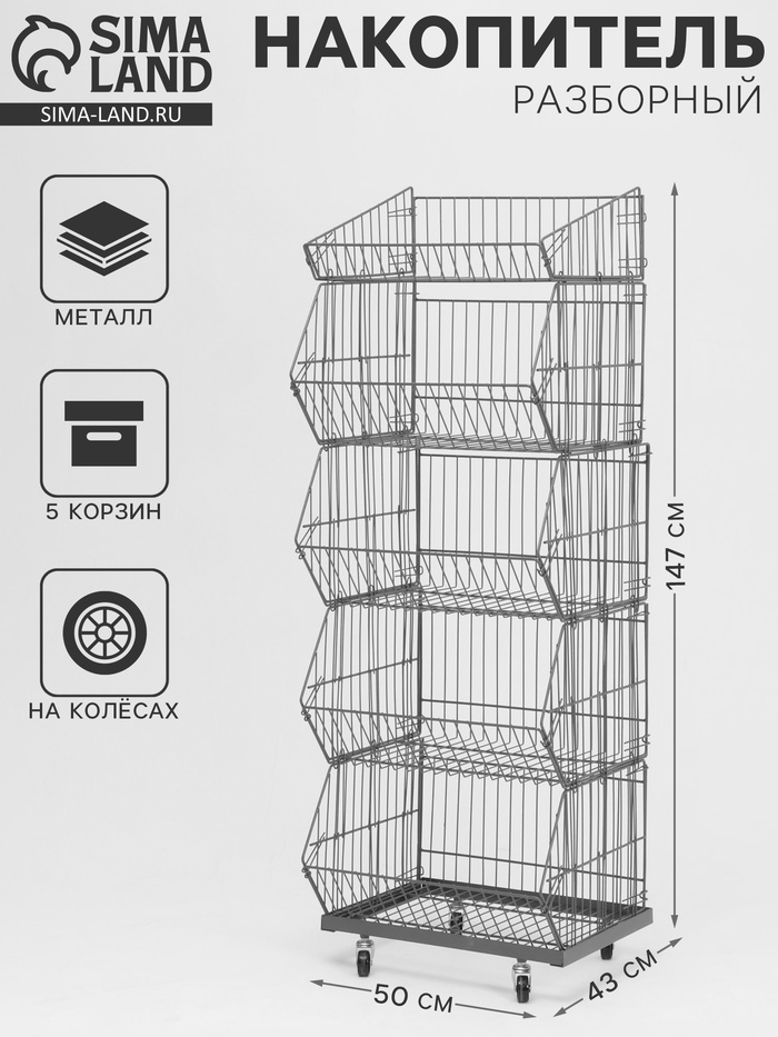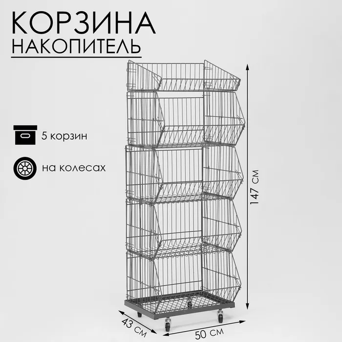 Накопитель разборный на колесах с 5 корзинами, размеры 50×43×147 см, цвет серый — это функциональное и удобное решение для организации хранения в доме или офисе. Разборная конструкция позволяет легко собрать и разобрать накопитель, что делает его удобным для транспортировки или хранения, когда он не используется.