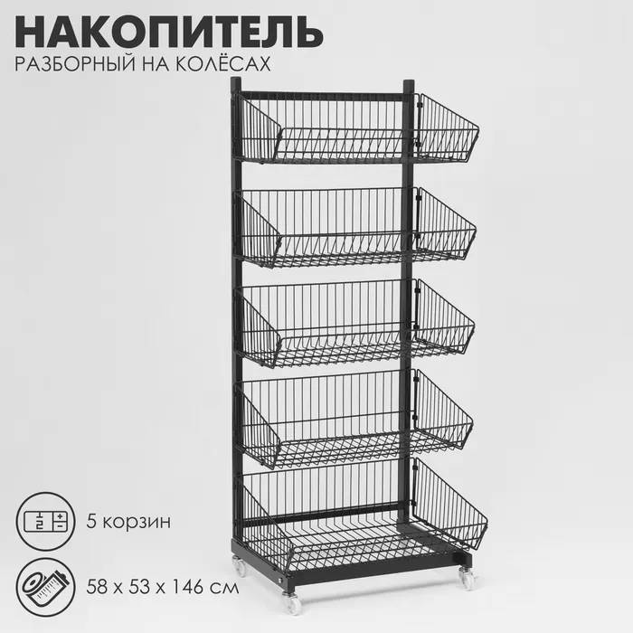 Накопитель разборный на колесах, 5 корзин, 58×53×146 см, цвет чёрный — это идеальный выбор для организации хранения товаров или аксессуаров в любых помещениях. Размеры 58×53×146 см и 5 корзин позволяют удобно сортировать и хранить различные предметы, обеспечивая легкий доступ и поддержание порядка.