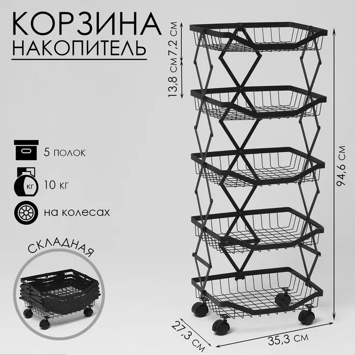 Накопитель складной на колесах, 5 полок, 35,3×27,3×94,6 см, цвет чёрный — это удобное и стильное решение для хранения и организации различных предметов. С размерами 35,3×27,3×94,6 см и пятью полками, накопитель предоставляет достаточно пространства для сортировки и удобного доступа к вашим товарам или аксессуарам, поддерживая порядок в вашем помещении.