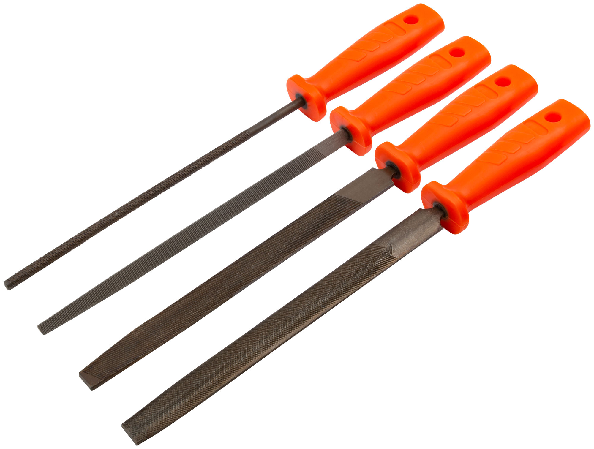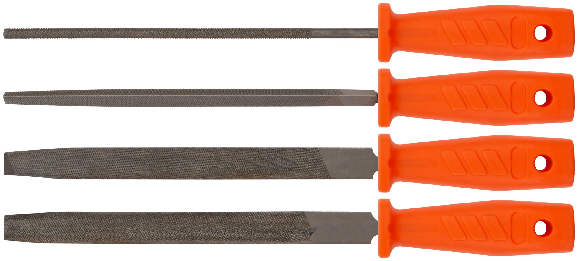 В комплект входят четырехгранный, плоский, круглый и полукруглый напильники, каждый из которых выполнен из инструментальной стали. Это обеспечивает долговечность и надежность в работе. Пластиковая ручка гарантирует комфорт при длительном использовании.