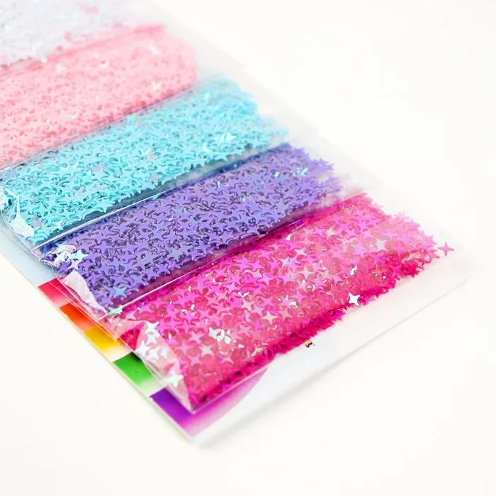 В наборе есть блёстки пяти цветов в индивидуальных пакетиках.