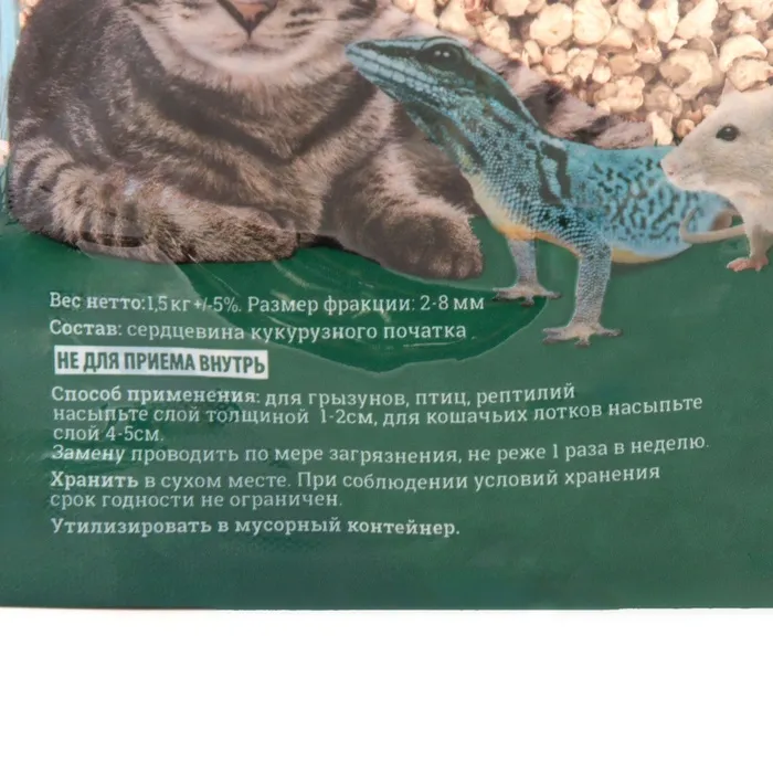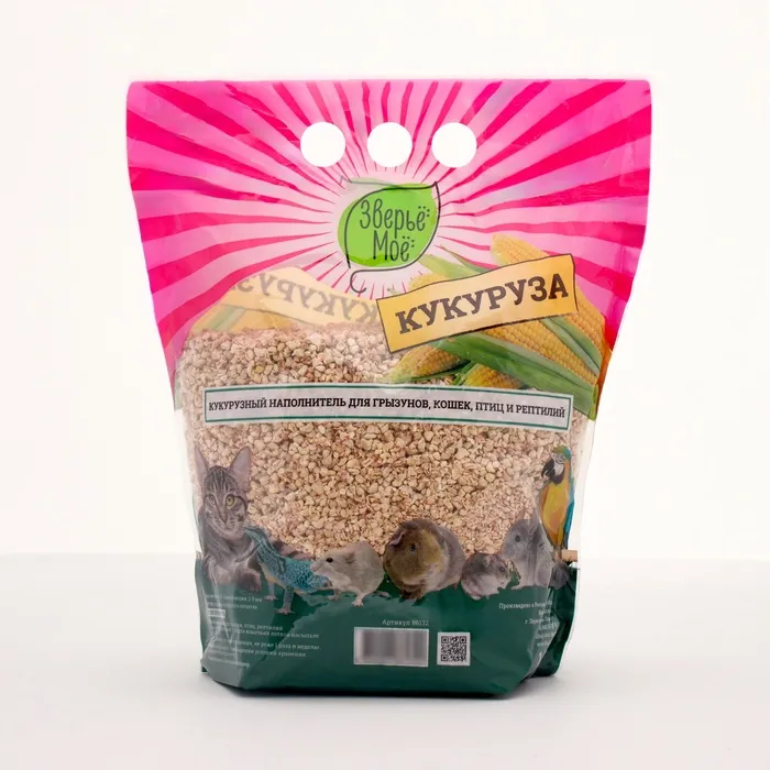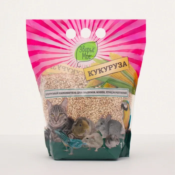 Наполнитель кукурузный "Зверье мое" - это экологически чистый продукт, который подходит для использования в качестве подстилки для грызунов, птиц и рептилий.
