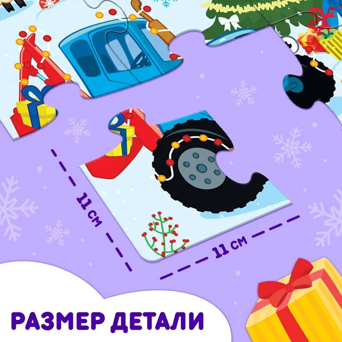 Напольный пазл с новогодним сюжетом — то, что нужно для полезного и интересного досуга! Большие элементы и красочные иллюстрации с героями мультфильма «Синий трактор» заинтересуют малыша. Такой подарок поможет ребёнку скрасить ожидание Нового года и весело провести время.