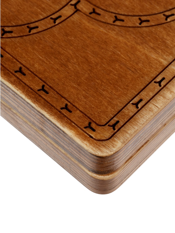- Декоративная гравировка: Изображение львиной семьи аккуратно нанесено на поверхность доски и подчеркивает природную текстуру дерева, добавляя изделию выразительный характер.