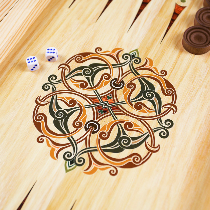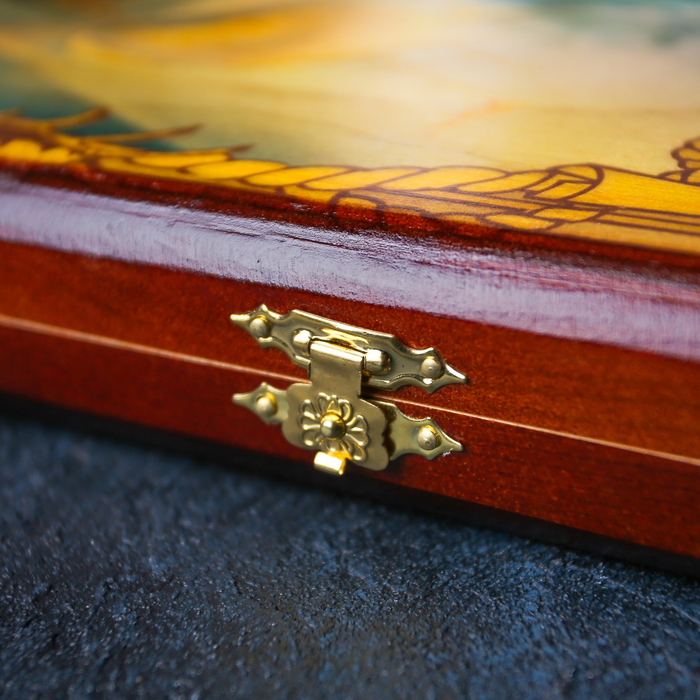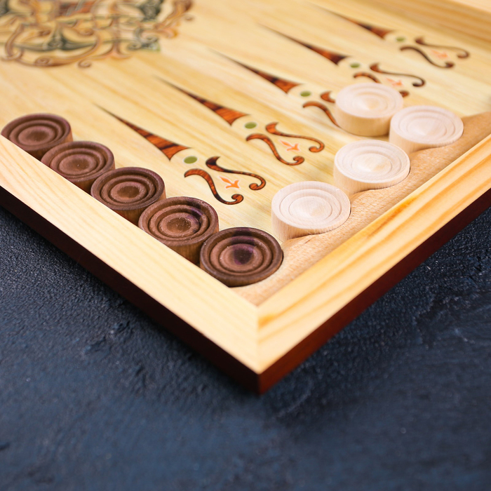 Нарды изготовлены из натурального дерева и представляют собой деревянный кейс с металлическими замками, размером 50 на 50 см в разложенном виде.