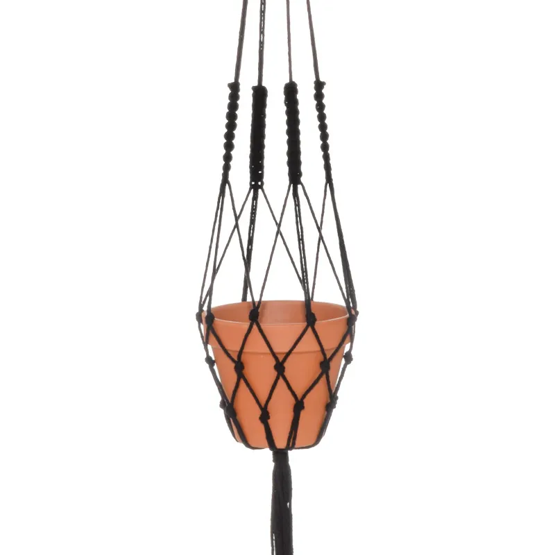 Стильное черное макраме подвесное кашпо поможет вам освободить пространство и добавить уровня вашим комнатным и зелёным растениям. Оно также отлично защитит ваши растения от любопытных домашних животных. Максимальная нагрузка 8 кг, длина 107 см.