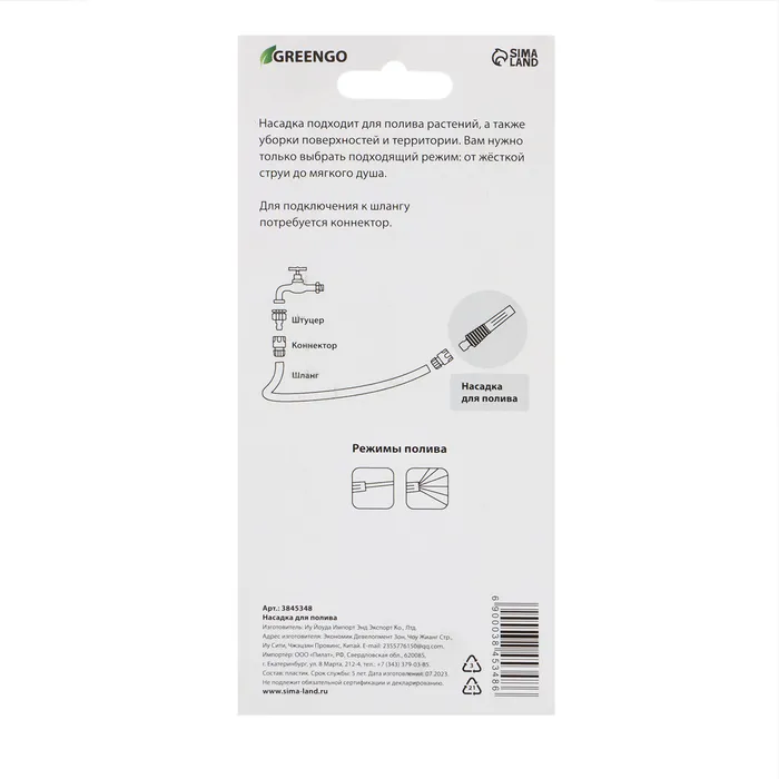 С насадкой Greengo процесс полива вашего участка станет комфортнее. Изделие выполнено из пластика и имеет стандартное быстросъёмное соединение. Поливайте клумбы и грядки, мойте садовые дорожки и инвентарь — достаточно выбрать нужную подачу воды.