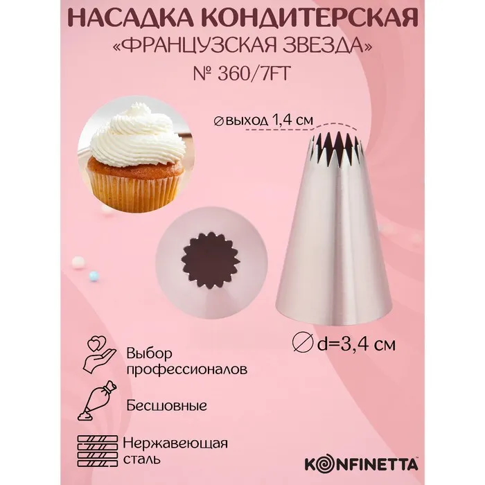 Насадка предназначена для нанесения на десерты необычных украшений из крема. Пользоваться изделием просто: достаточно присоединить его к универсальному кондитерскому мешку.