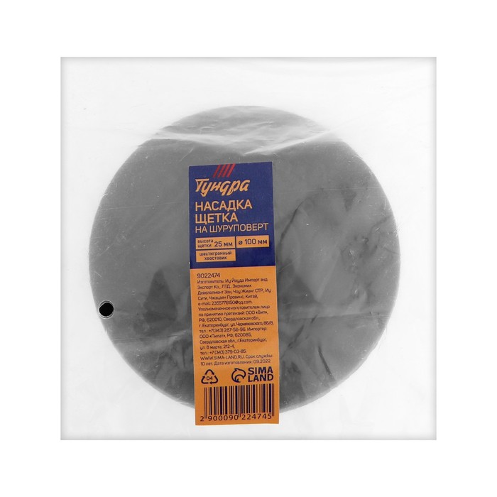 Корпус щётки выполнен из прочного пластика. Щетина выполнена из нейлона средней жёсткости. Диаметр щётки составляет 100 мм, высота 25 мм. Шестигранный хвостовик надёжно фиксируется в патроне инструмента.