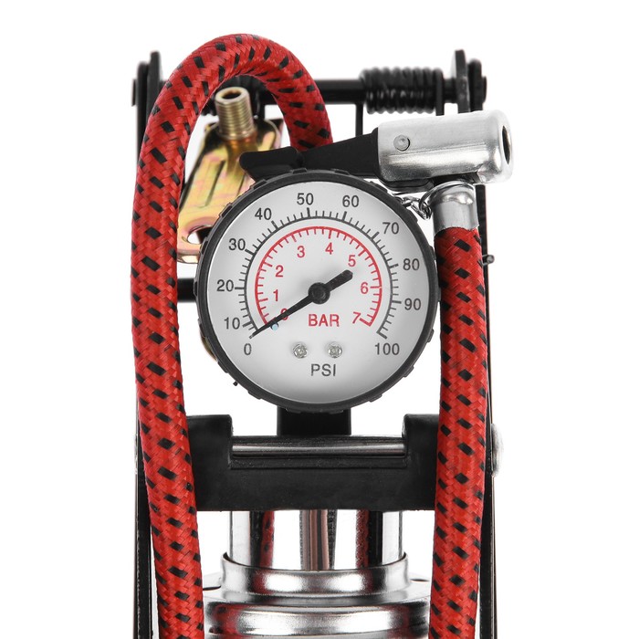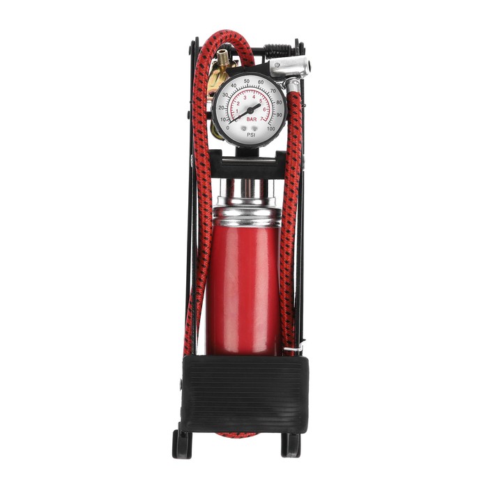 Ножной насос применяется для накачивания шин автомобилей, мотоциклов и велосипедов, а также надувных детских игрушек, матрасов, спортивных мячей и других подобных изделий. Насос оснащён манометром для измерения давления воздуха. Для удобства пользователя педаль насоса имеет специальную рельефную противоскользящую накладку.