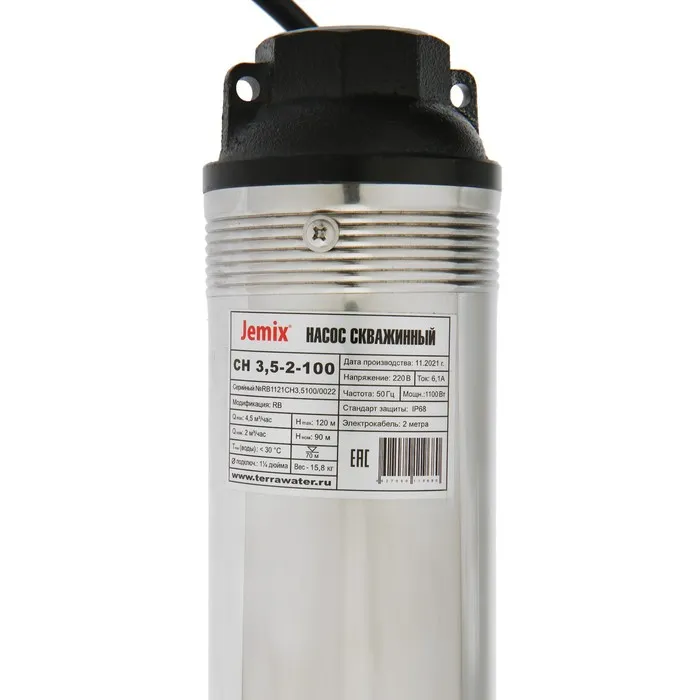 Насос скважинный JEMIX СН 3.5-2-100, центробежный, 1100 Вт, напор 120 м, 75 л/мин, кабель 2 м — Характеристики