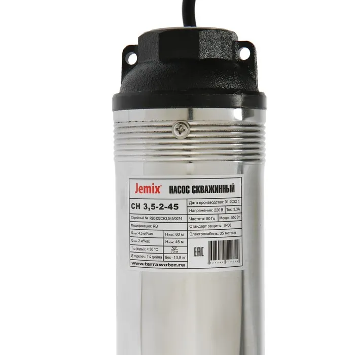 Насос скважинный JEMIX СН 3,5-2-45, центробежный, 550 Вт, напор 60 м, 75 л/мин, кабель 35 м — Характеристики