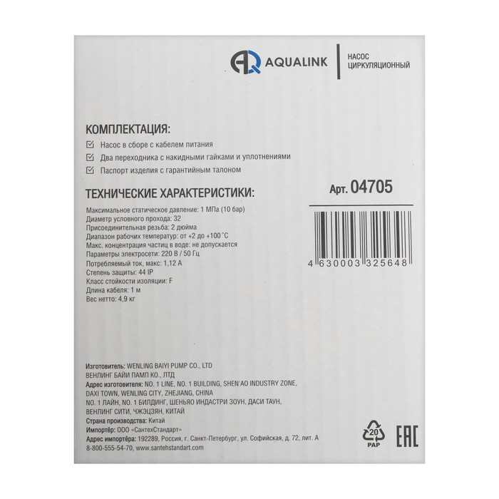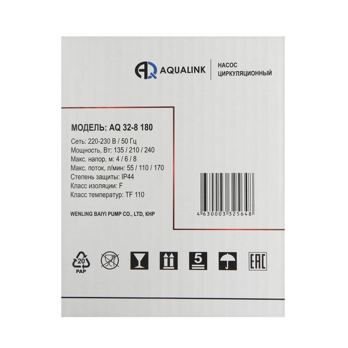 Насос циркуляционный AQUALINK 32-8 180, напор 8 м, 170 л/мин — Характеристики