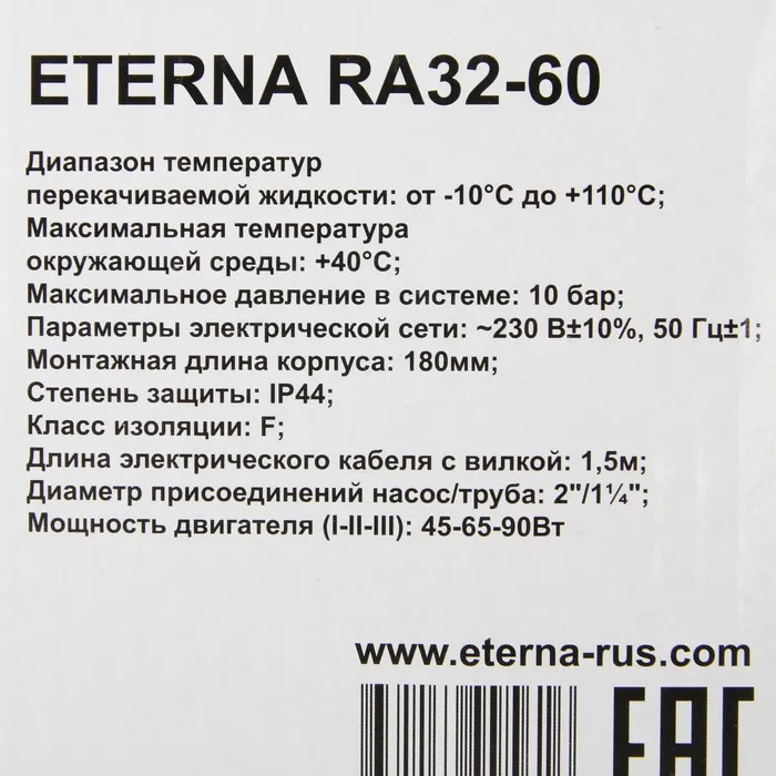 Насос циркуляционный ETERNA RА 32-60, напор 6 м, 72 л/мин, кабель 1.5 м, 45/65/90 Вт — Характеристики
