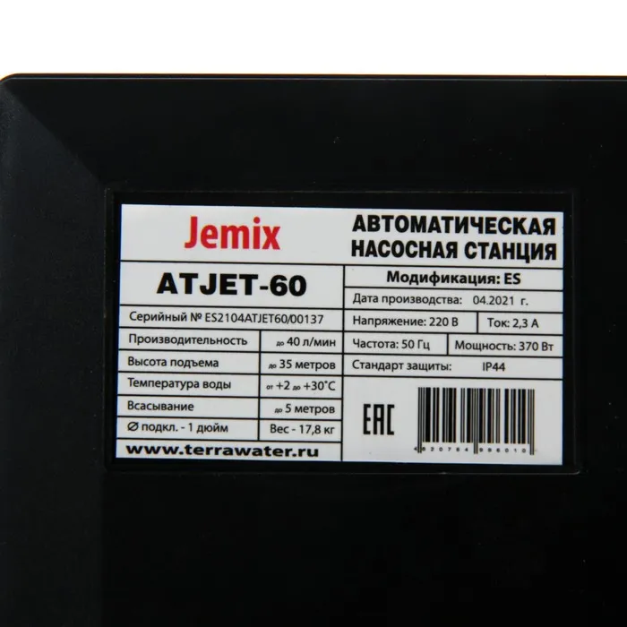 Насосная станция JEMIX ATJET-60, 370 Вт, напор 35 м, 40 л/мин, бак 24 л — Характеристики