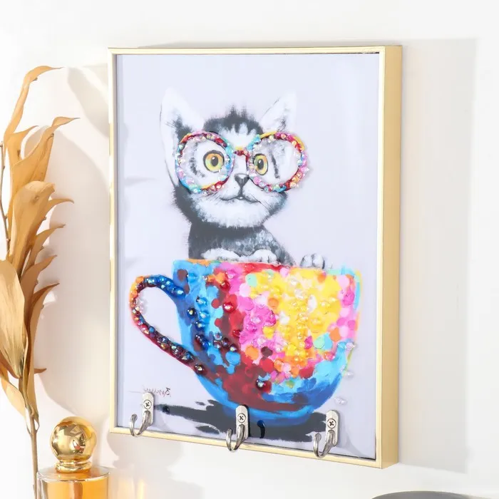 Настенные крючки декоративные «Чашечка котэ», 3 крючка, пластик, МДФ, стразы, золото, 18.5×1.8×23.5 см — Характеристики